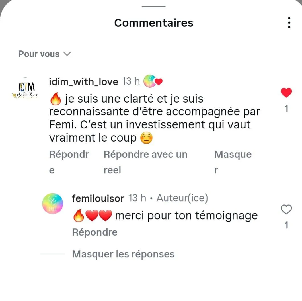 Si tu n'a vraiment aucun résultat sur toi (état de stress) ou sur ton quotidien apprès avoir appliqué sur au moins 15 jours les conseils post profils y compris avec les ajustements que Fémi pourrait faire, alors je te rembourse.