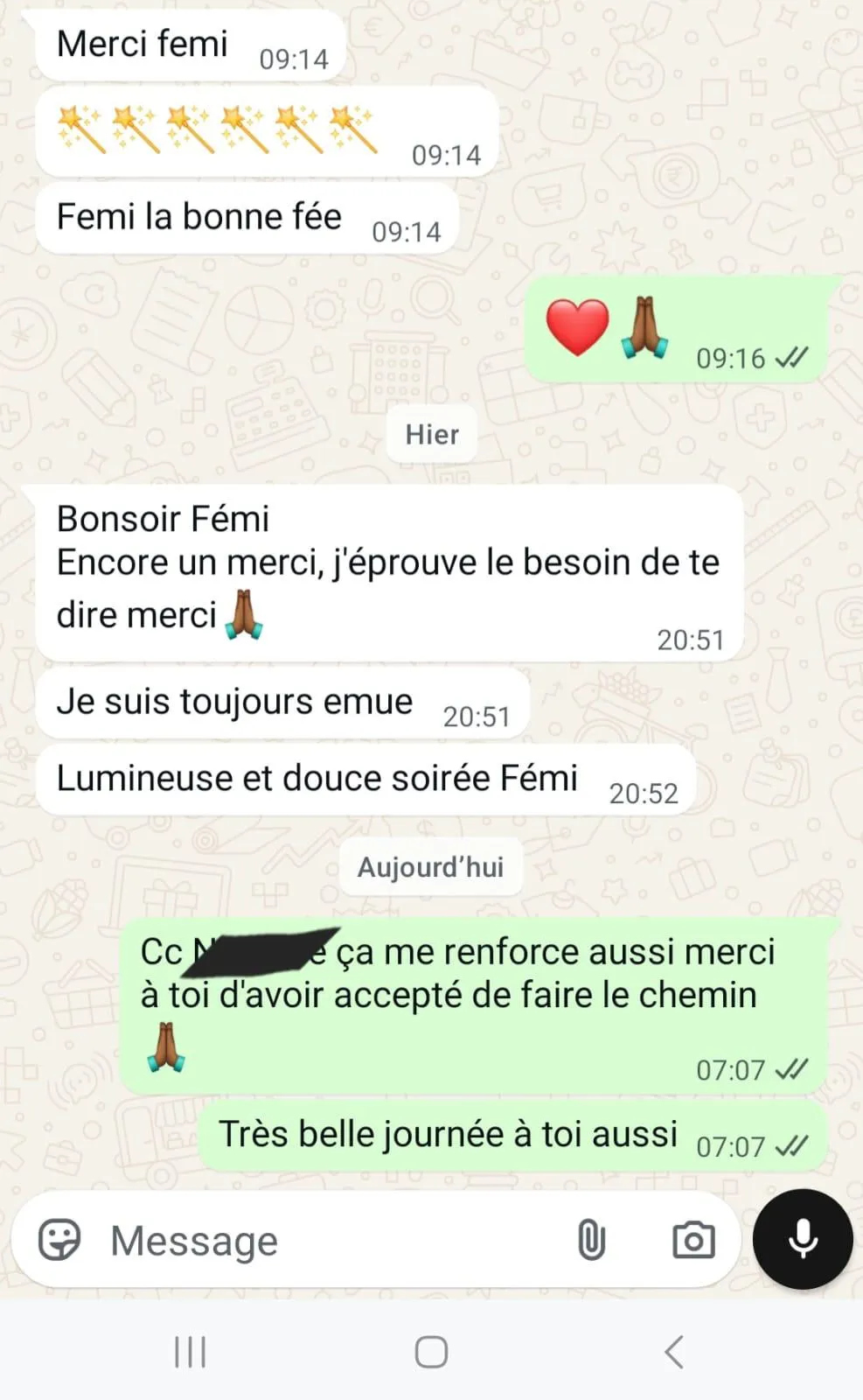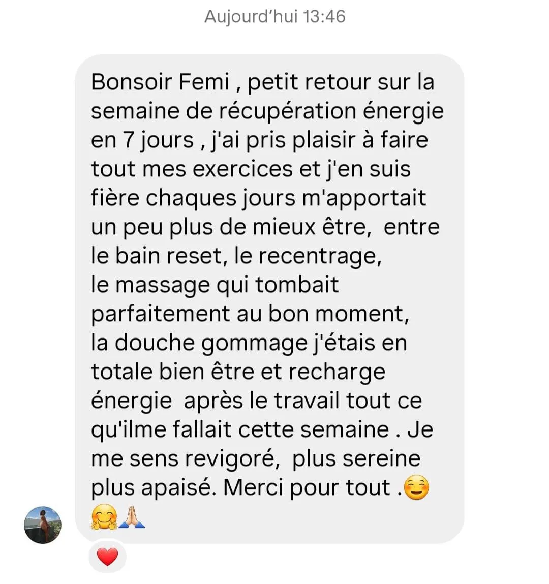 Et par dessus tout, Fémi est très pragmatique. Elle propose tout ce qui a montré des résultats palpables jusqu'à ce jour, en dehors des modes. Se sentir mieux ne suffit pas. As- tu changé ta façon d'aborder ta vie? As-tu changé ta façon de prendre des décisions? Car ce sont ces facteurs qui permettent ensuite de changer sa réalité.